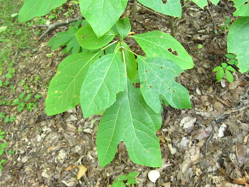 Sassafras trees spring up anywhere they can in our woods. They’re the first trees to appear in a burned area. They have variable leaf shapes on the same branch. The mitten shape is an identifier. When we cut through sassafras roots in building our shop, the air became scented with a pleasant root beer-like fragrance. This is a small sapling by the large hickory in front of the shop.