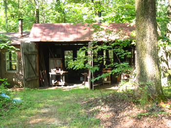 The shop itself has a large hickory in front, slightly smaller hickories on the northeast and west corners. Sassafras saplings ring the building and there’s a small cedar by the door to the shop addition where George works. The large hickory in front of the shop is almost 22 inches in diameter. In the fall hickory nuts hit the shop’s tin roof with a bang.