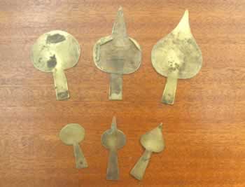 What’s It? These templates we’ve cut from 20-gauge brass are essential in forging cusps to the right size and shape. George runs a silver pencil around the slightly-undersized contour to draw onto the anvil a shape for comparison when we forge cusps. After the cusps are forged and cool, he again draws the template’s contours, this time directly onto the cusp. He’ll then remove excess material by grinding or filing. Each cusp is the same as each other cusp, but no two are exactly alike.
