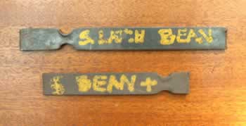 What’s It? Gauges for setting the stop on the blacksmith’s helper tool. The blacksmith’s helper makes the indentations that set off the mass that will be a cusp from the mass that will be the handle when we forge latches. These gauges let us set the stop so that we get the same amount of mass for the cusps and handle every time. We use the gauges pictured in making bean latches and bars. Other gauges are used when we forge heart or ball and spear styles.