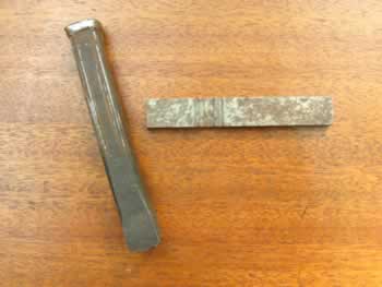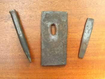 What’s It? It’s not hard to guess the purpose of these slot-cutting tools used to cut the slots in latches. The bolster in the middle of the picture supports the red-hot latch as George cuts the slot using the specially-shaped chisel on the left. He drives the drift shown on the right into the slot to make the hole the correct size and to refine it. Successful slot cutting depends largely on the skill of the blacksmith.
