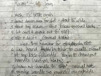 Our most fundamental specialized tools are our notebooks. Hundreds of decisions are involved in making each item. What size stock do we begin with? What is the sequence of steps? What is the correct heat for this step? What is the most efficient hammer to use? What angle of blows works here? Could a different jig or tool produce better results? Our notebooks help us make products for Horton that have a certain size and shape and are regular in appearance and finish, to match the examples shown in the print catalog and online. Our notebooks allow us to refresh ourselves when we make something we haven’t made for a period of time. As our understanding of the process grows, we revise and add to the knowledge contained in our notebooks.