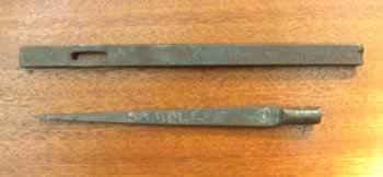 What’s It? A design stamp. Most of the forging of bars for Suffolk latches, after initial delineation by the blacksmith’s helper tool, is done without special tooling. The exception is at the end of the forging, when we use this tool to stamp a design element onto the bar near the cusp. To make this tool, we created the desired design on a piece of tool steel. A bar of mild steel was driven, while extremely hot, onto the piece of tool steel, creating a negative impression of the stamp. This bar (on the left in photo) is the tool we’ve used over the years for stamping the design onto each latch bar. The bar seen on the right is the tool-steel master used to stamp the tool when it was made.