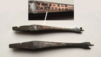 Smiths 200 years ago had three types of tool steel available. Blister steel, the least expensive, was made by placing large bars of wrought iron surrounded by leather scraps in huge kilns where they were heated to high temperatures. The bars were crudely case hardened and had a blistered appearance but still retained a wrought iron core. Shear steel was made by reforging the blister steel bars into a more homogenous product. Cast steel was the most expensive steel of its time. It was made by cutting bars of shear steel into small pieces and melting them in a crucible. This was a truly homogenous material with wonderful edge-holding properties for tradespersons’ tools. Often quality tools of the period are marked “Cast Steel.” Here are a couple of nineteenth century center bits for woodworkers. One is marked and still has its temper color.