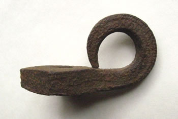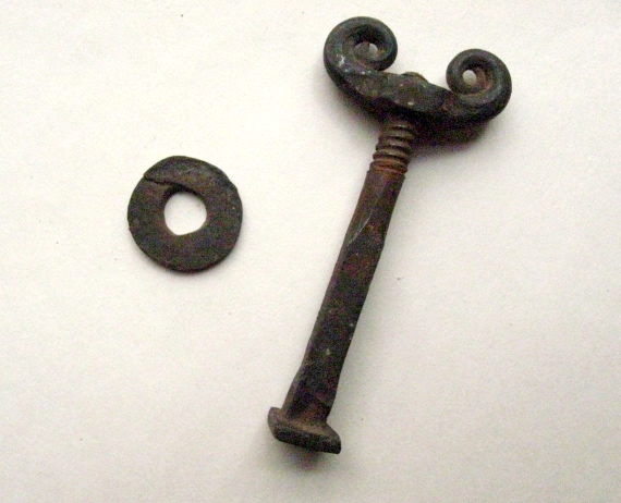 Because of the weakness of wrought iron and its easy workability, a smith formed this washer by wrapping a piece of iron in a circle and forge welding the ends. The overlap is clearly visible. Ram’s horn nuts are useful, beautiful, and necessary adaptations for wrought iron’s weakness.