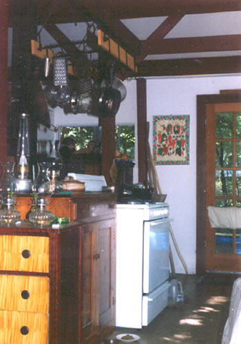 This is a photo showing the kitchen area of the house in the northeast corner. One of Mollys pot racks hangs above the counter.