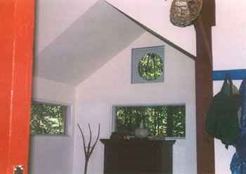 The house is 16 x 28 feet and has a postmodern nook addition which is 4 x 8 feet on the north side. It has a large number of windows on several levels. The cathedral ceilings are 12 feet high in the center of the house to allow room for the sleeping loft.
