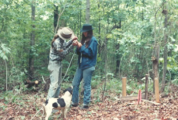 George, Molly and the Lanes dog Chumley are working with the water level for setting up the batter boards. Before laying out the building we cleared an area by hand.