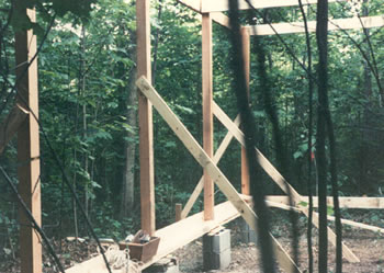 This shows the basic frame of the Shack, the posts rest above the piers. Everything is pretty shaky at this stage so bracing helps keep things upright.