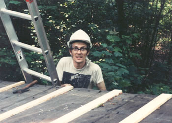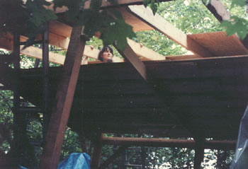Molly is working on an impromptu loft, using it as scaffolding while we put up the plywood roof sheathing. We slid sheets of plywood up poles (one is to the left in the picture). A person on the roof would catch the sheet and draw it the rest of the way up.