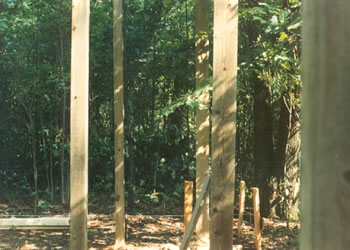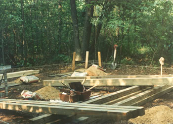 We’ve cleared the site for the building and have dug the holes for the posts. The pressure treated posts are then raised, dry cement poured in to secure them, and braced until more framing will hold the posts stead. The moisture in the ground over time will set the cement.