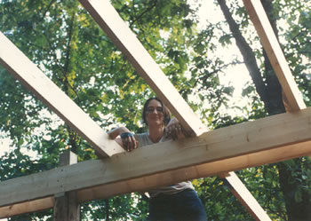 After the posts are set up wall plates and roof plates are attached, tying everything together. The next stage is the rafters. Molly is waiting for the next rafter to set up on her right.