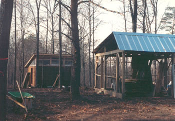 This picture shows the Shop in front with the Shack in the background. Before the siding went up there were forest fires in the area. A neighbor used a bulldozer to clear out the brush and saplings around the two buildings and did a wonderful job of leaving the trees.