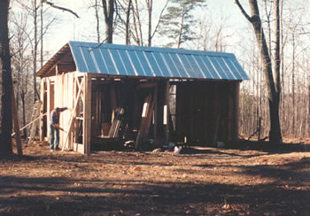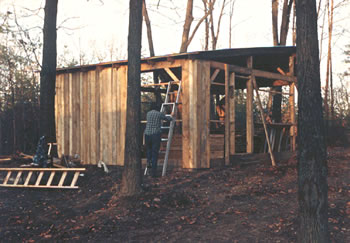 The siding was rough cut pine which was in random widths. It went up quickly over a weekend. The galleries on the north and south walls under the roof above the main wall area received siding later on. Each wall also had a hinged door for ventilation in this area.