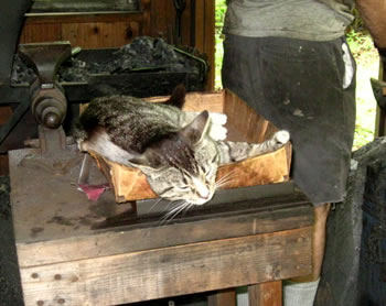 Kitty Boy also became comfortable with his duties as forge cat. Here he's taking a nap on the vise bench while George works in the shop.