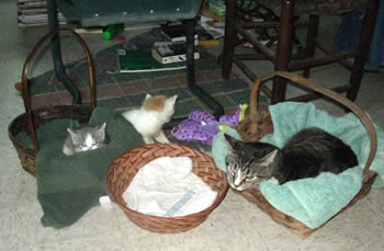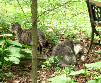 The kittens appeared, as if by magic, under the north overhang of the addition in May 2010. We took in Grey and Blondie who had been abandoned by their mom. Kitty Boy took an active hand in helping raise them. Bobo didn't want to have much to do with the kids until they got older.