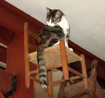 Peach Blossom is still more feral than not, though that's changing every day. Here she is sitting on one of the child's chairs hanging from a beam in our house. She's comfortable with heights.