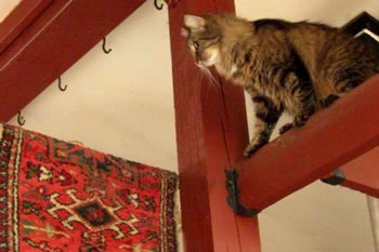 This is storm trying out beam walking. She doesn't have the finesse that Peach Blossom has and after several falls has given up. In this photo she's getting ready to make a leap across several feet from the beam to the loft.