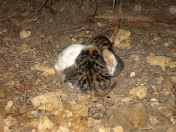 The three kittens, when we first saw them under the addition, were piled on top of each other for warmth. The top kitten is the one the momma cat took with her.