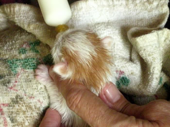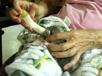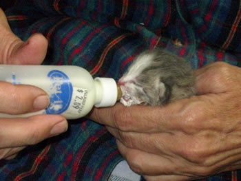 5/23 -- This is Grey being bottle fed by Molly using a baby bottle type feeder. The nipple on this one is enormous.