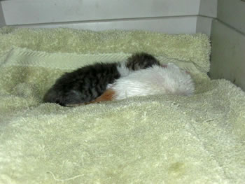 5/28 -- We kept the kittens in a cat carrier for the first two weeks. They had a towel and foam pad with a hot water bottle under the towel to keep them warm. For the first two weeks the kittens need to be kept at about 85 degrees. If they got too warm, they could crawl off the portion of the towel over the hot water bottle, as they've done here.