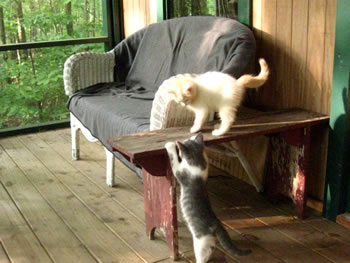 8/2 -- Grey's with Bobo on the front porch. The kittens like the ledge to run along and the screen to climb.