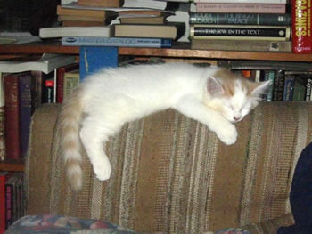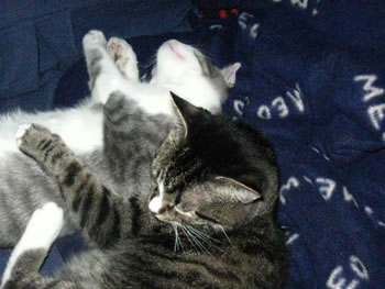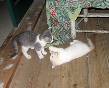 8/16 -- Grey and Blondie collapsed under the chair. They never lost their closeness from when they were baby kittens.