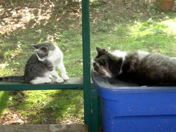 8/27 -- Both Grey and Blondie have figured out how to use the cat door to get out onto the screened porch off the addition. It's still a favorite play area.