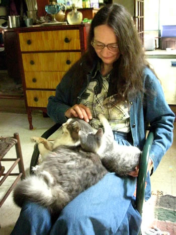 8/8 -- When the kittens began playing under Molly's rocker we replaced it with a chair so there wouldn't be an accident. Lap time has always been important to Bobo and Grey has joined in here.