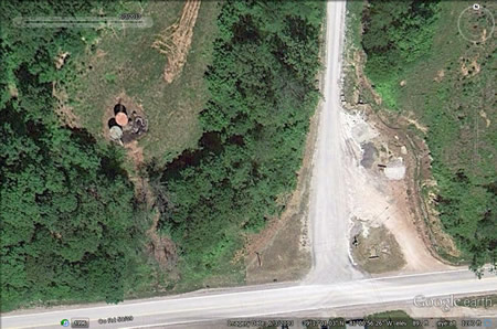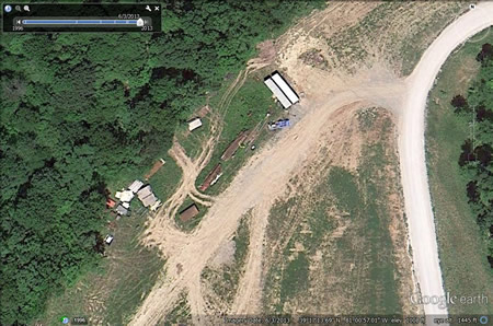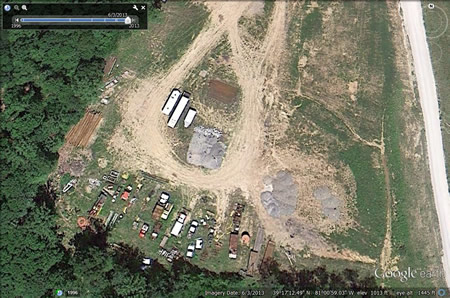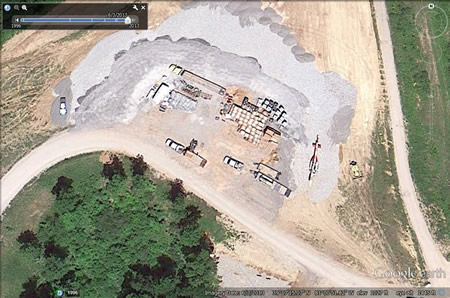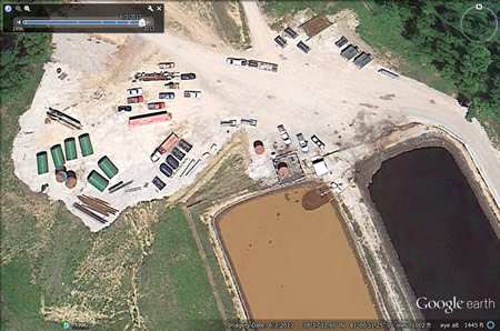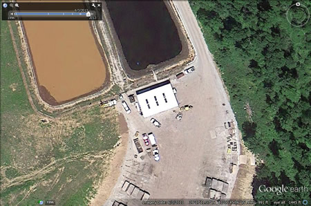 The facility is large and complex. A group of Google Earth images is available, keyed to the image below. Clicking on a letter will bring up that area's Google Earth image. The whole facility can also be seen. Area A was the site for injection well 47-085-09669. Area E is the site for injection well 47-085-09909. Areas B, E, G, and H appear to be used to store materials for drilling wells. Area F appears to have gravel and other materials and also serves as a helicopter pad. D and C are the two large pits on the site. The large building shown in C possibility is the flowback recycling facility. I is another well.