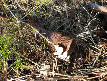 The large scrap item is in what we think might have been a drill pit. The hillside up to the pad is to the left. To the right, not plainly visible in the photograph is an earthen bank that is several feet high.