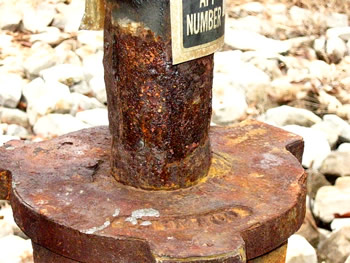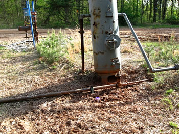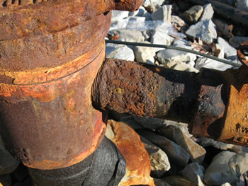 The metal pipework at the well site is long overdue for paint. This photograph shows a heavily corroded pipe at the wellhead.