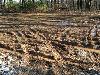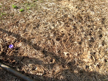 This area had a large number of deer tracks, unlike the rest of the well site. After the new dike for the tank was constructed in September 2008 the crew seeded and mulched the area. Seed hasn't germinated here. The soil tested at 136 mg/l chlorides.
