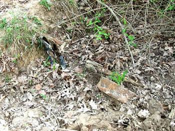 This is the southern edge of the notch. Black plastic is visible to the left in the photograph. There is a round scrap piece of metal to the right of the plastic. The notch is apparently where pit waste had been buried and was now exposed.