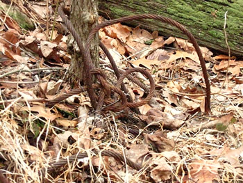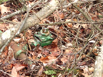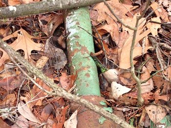 Beyond the pad we found cast off pipe, a large iron or steel object and remains of another steel drum. We also found what we call the "notch" on the edge of the level pad in an overgrown area. The notch is a rectangular shaped cut in the hillside with pieces of black plastic embedded in the sides of the notch. There is an iron or steel object and a piece of lumber along with other trash in the notch which seems to remain wet most of the time. There are a large number of deer tracks here and on the pad by the wellhead at the separator.