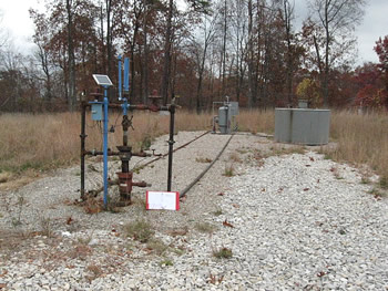 This site is next to Harmon's creek road and the access drive to the well is graveled. The site itself is poorly vegetated on the pad. Pipework needs to be painted and at one spot, an elbow joint in the tank inlet pipe, we couldn't tell if the stain on the gravel was from rust or indicated a fluid leak.