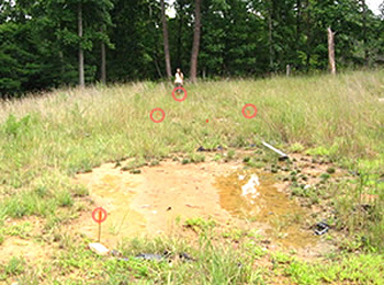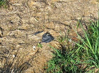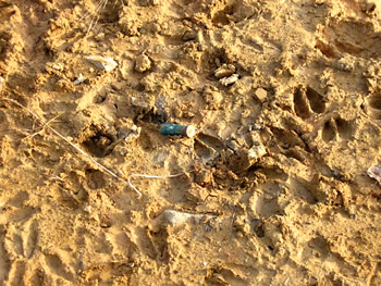 There were few signs of deer activity in the bare area when we took samples in July 2009. When we returned to the site in October 2009 the area was covered with tracks. The green shotgun shell marks the location for where we took the sample for laboratory testing.