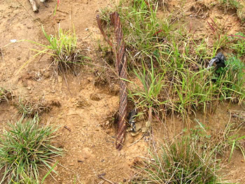 In the center of the perimeter of black plastic this piece of steel cable emerged from the soil. We believe it may have been used to pin the folded over edges of pit liner before the pit was covered up. We saw a similar piece of steel sticking up from the pit's surface at 47-079-01492.