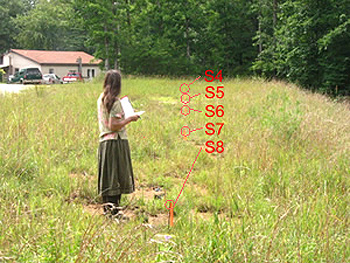 Each soil sample on the traverse line through the perimeter of black plastic had a number. S5 is also the location of the laboratory sample. This photo was taken looking west.