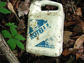 On the hillside below the well site we found two empty gallon plastic jugs that had been discarded. One originally held bar oil for chainsaws. This jug originally held a Shell oil for diesel engines.