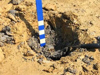 To take the sample for laboratory testing we dug down 4 inches below the surface into what we believe is pit waste (the dark gray material began about an inch or so below the surface). We took two samples for the laboratory, one at 4 to 5 inches below the surface and the other (not used) at 5 to 6 inches below the surface.