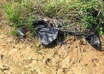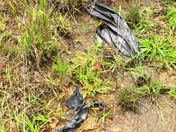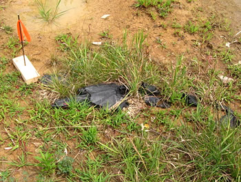 We returned to the site in July 2009 with one of the surface owners and immediately noticed large pieces of thick black plastic sticking up from the ground. We took two soil samples in a bare area and returned to the site to begin a full assessment.