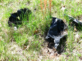 A large area bare of vegetation is visible in the photo in the center left. Two large pieces of pit liner are barely visible just beyond the bare area.