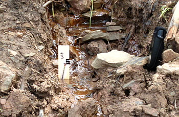 This is the fill slope showing drainage from the pit above and to the right of Molly. Soil sample S6 (<30 mg/l) is on the fill slope and away from visible drainage signs.