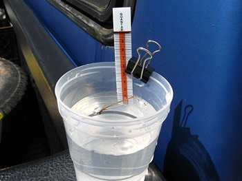 We collected a sample of water going into a culvert and used a binder clip to hold the test strip to the cup. The thick black line on the test strip shows that the test is done.