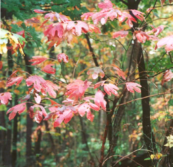 Each tree species has a different color and time for fall color. This is a young Sassafras tree by the blacksmith shop.
