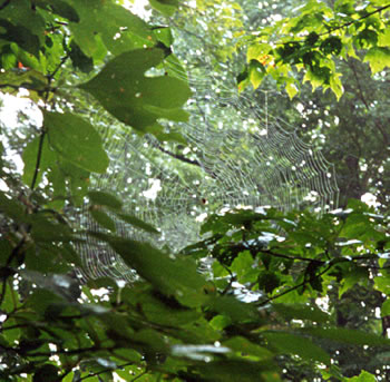 Spider webs of all varieties appear throughout the woods, but are only seen at special times, such as after a heavy dew. The webs are found amongst the leaves on the ground and in the tree tops overhead.